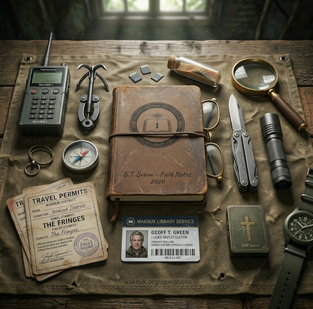 A peek inside the life of a Waknuk Library Service Investigator while in the field. Contributed by our Lead Investigator, Geoffrey Tarzan Green who now has many years of experience and numerous missions to the Fringes, the Badlands and beyond.